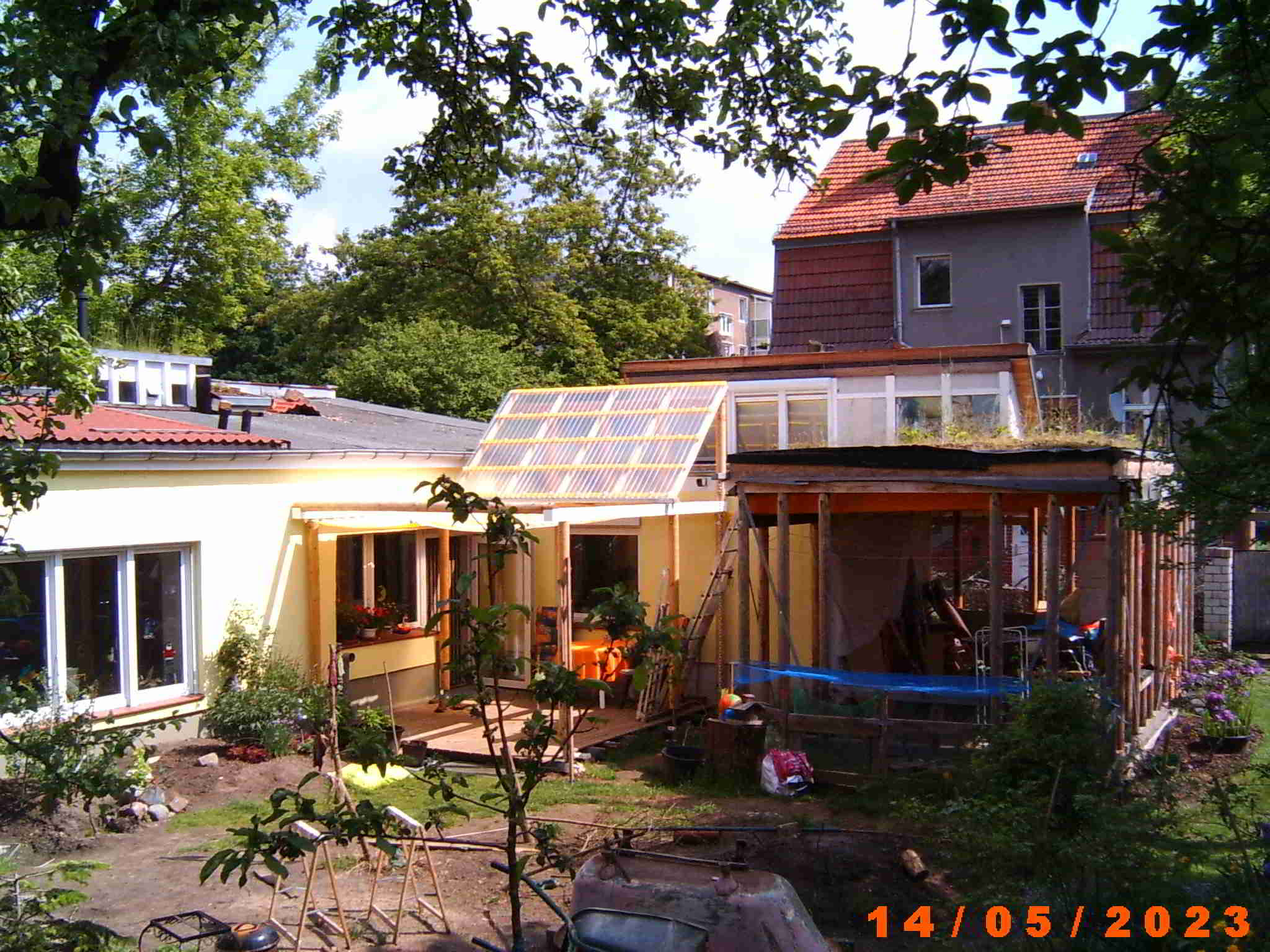 Eine erste praktische Durchführung erfolgte 2008 bei der Errichtung meines Büroanbaus. Hier konnte ein Holzständerwerk realisiert werden, welches später mit Lehm ausgefacht und verputzt wurde. Dieser Prototyp steht jetzt, neben einem von mir geplanten Passivhaus, Pate für die jetzige Weiterentwicklung.